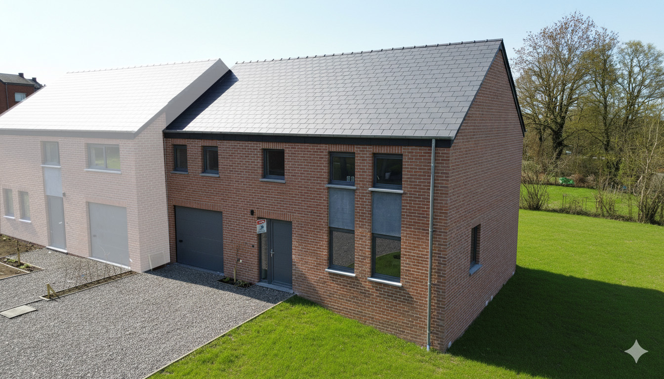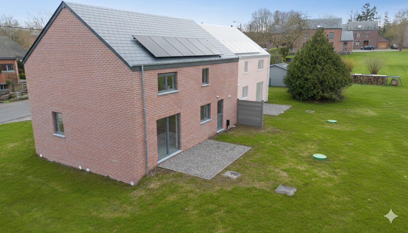 Située dans un environnement résidentiel calme à Aye, cette maison neuve se trouve au cœur d’un quartier à l’atmosphère familiale et paisible, bénéficiant d’une bonne intégration dans le tissu local. L’ambiance est sereine, propice à une vie quotidienne confortable, à proximité immédiate de la ville de Marche-en-Famenne. L’arrêt de bus le plus proche se situe à +/- 450 mètres, et la gare de Marche-en-Famenne est accessible en +/- 7 minutes en voiture. L’accès à la N4 s’effectue en +/- 5 minutes, facilitant les déplacements vers Namur ou Luxembourg. Une école fondamentale se trouve à +/- 800 mètres, tandis qu’une crèche est disponible à moins de 5 minutes. Une pharmacie se situe à +/- 2 minutes, et un médecin généraliste est accessible à +/- 1 km. Un supermarché est présent à moins de 5 minutes de route. Les commerces de proximité, boulangerie, banque et salle de sport sont situés dans un rayon de +/- 1 à 3 km. Ce bien trois façades développe une surface habitable de +/- 172 m² sur un terrain de +/-5,13 ares. La maison dispose d’un garage intégré de +/- 21 m² avec espace buanderie. La terrasse, orientée à l’ouest, permet de profiter d’un bon ensoleillement en fin de journée. Le rez-de-chaussée comprend un hall d’entrée avec WC invités, un séjour lumineux de +/- 29 m², ainsi qu’une cuisine ouverte de +/- 11 m². À l’étage, le hall de nuit dessert une chambre parentale avec dressing de +/- 18 m², une seconde chambre de +/- 15 m², une troisième chambre de +/- 14 m², ainsi qu’une salle de bain complète de +/- 9 m² équipée d’une baignoire et d’une douche. La maison est équipée d’un chauffage central au gaz et de 6 panneaux photovoltaïques. Le niveau de performance énergétique est classé A, garantissant un confort thermique et une consommation maîtrisée.