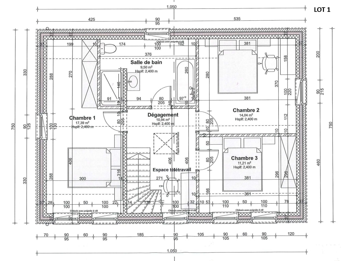 A l’étage, 1 chambre parentale de +/- 17,5 m² avec dressing, 2 chambres de +/- 14 et +/- 11 m² et une salle de bain de +/- 9,5 m².