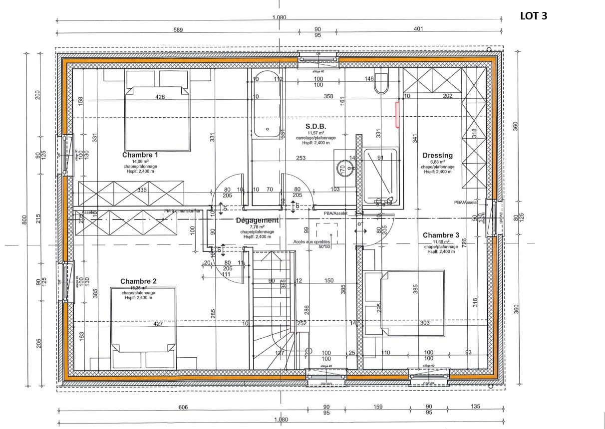À l’étage, le hall de nuit distribue 1 chambre parentale avec dressing de +/- 18,5 m², 2 chambres de +/- 15,5 m² et +/- 14 m², ainsi qu’une salle de bain de +/- 11,5 m².