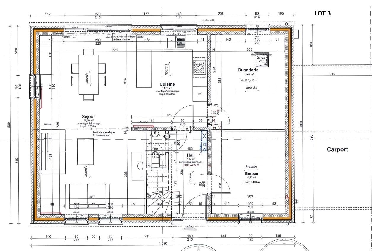 Au rez-de-chaussée, un hall d’entrée avec WC, menant à un séjour de +/- 29 m² ouvert sur une cuisine de +/- 11,5 m², un bureau de +/- 10m² et une buanderie de +/- 11,5 m². Le carport de +/- 18,5 m² complète le tout.