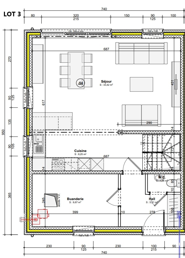 Au rez-de-chaussée vous trouverez un hall d’entrée, un WC invité et un séjour de +/- 33,5 m² ouvert sur un espace cuisine de +/- 8 m² et d'une buanderie de +/- 10 m².