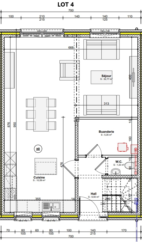 Au rez-de-chaussée vous trouverez un hall d’entrée, un WC invité et un séjour de +/- 33 m² ouvert sur un espace cuisine de +/- 10,5 m² et d'une buanderie de +/- 5,5 m².