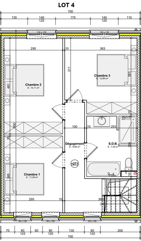 A l’étage, un hall de nuit qui dessert 3 chambres de +/- 15,5 m², de +/- 14,5 m² et de +/- 12,5 m², ainsi qu’une salle de bain de +/- 8 m².