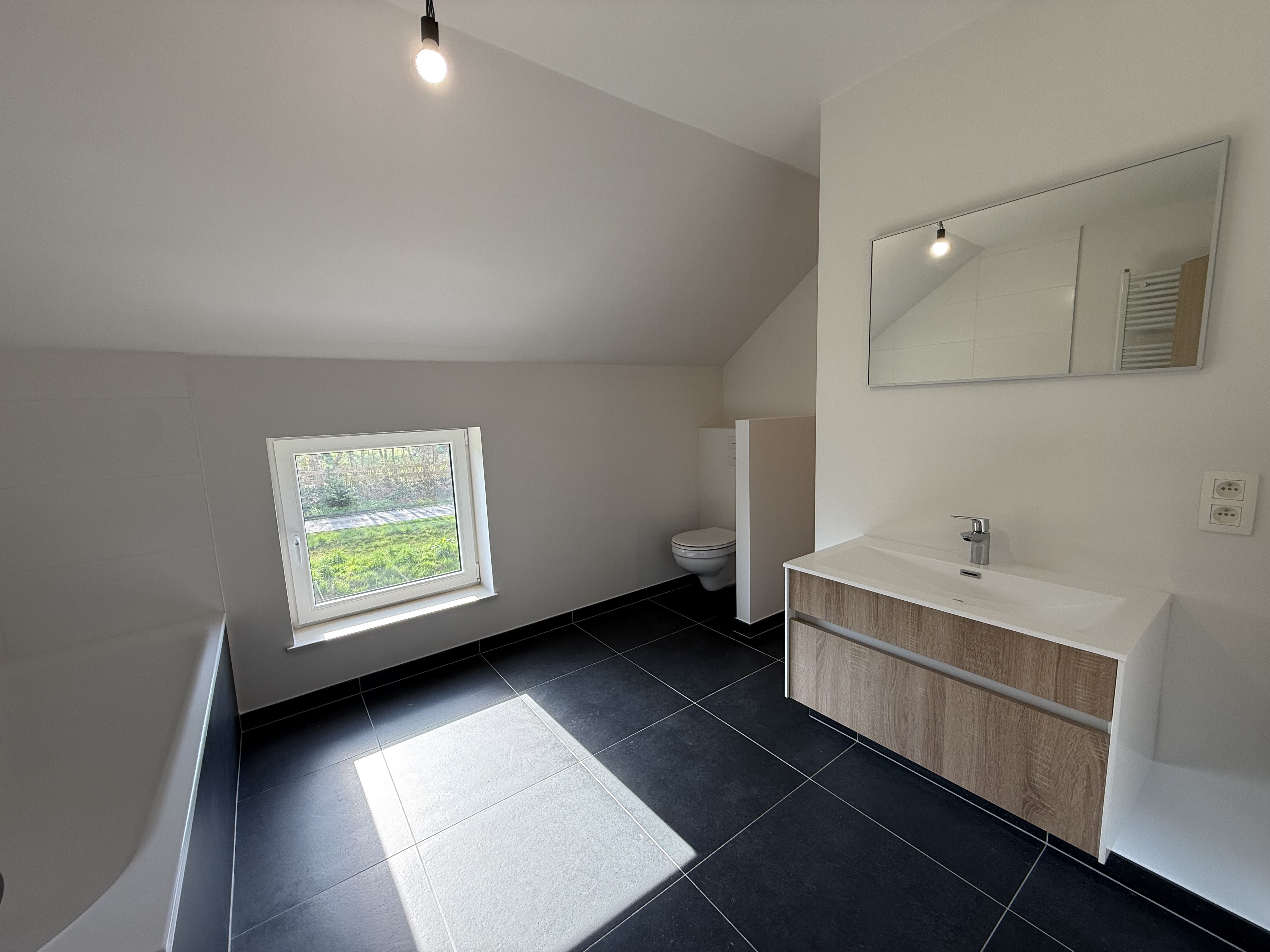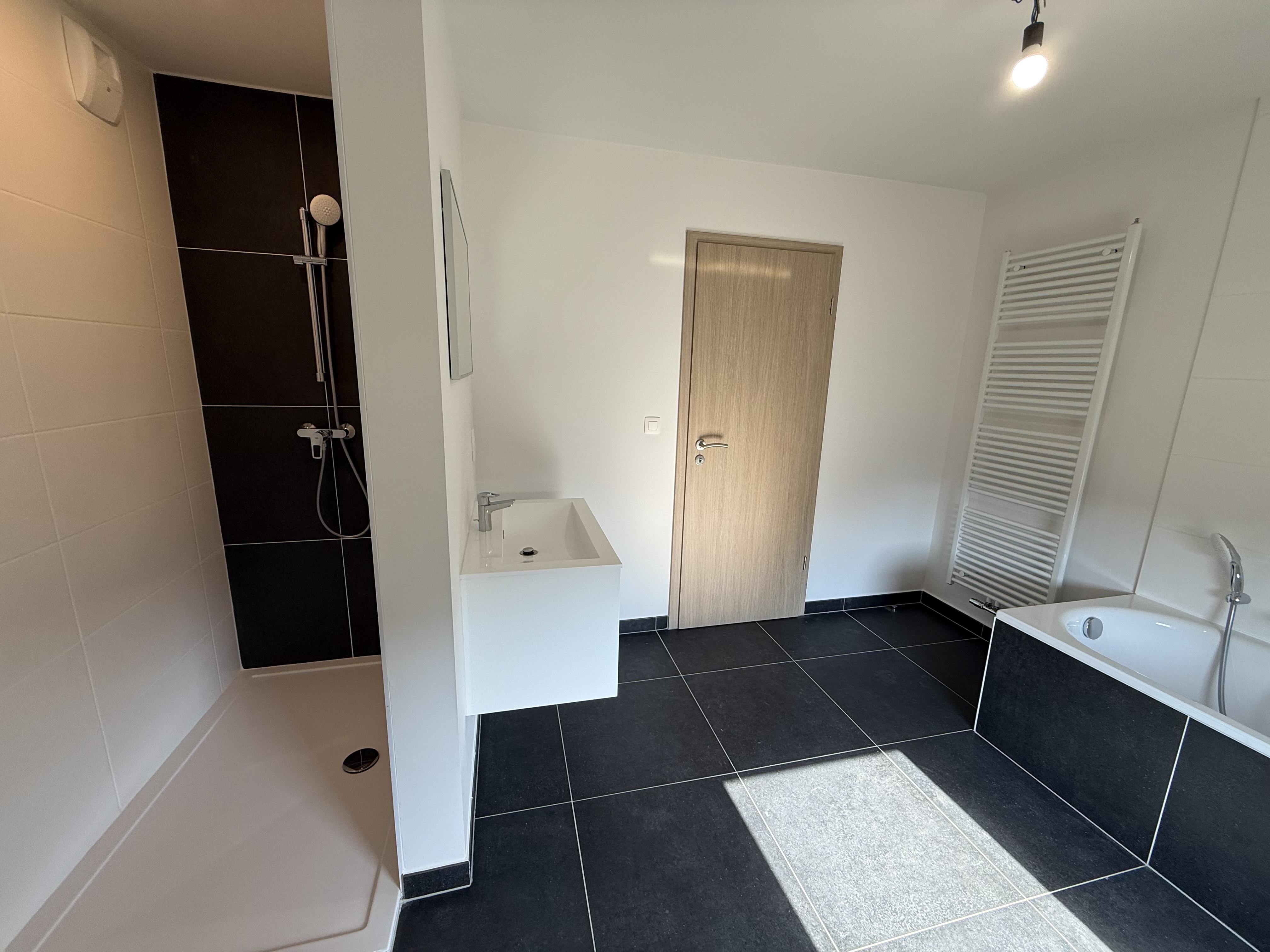• 1 salle de bains complète avec douche, baignoire, WC et lavabo