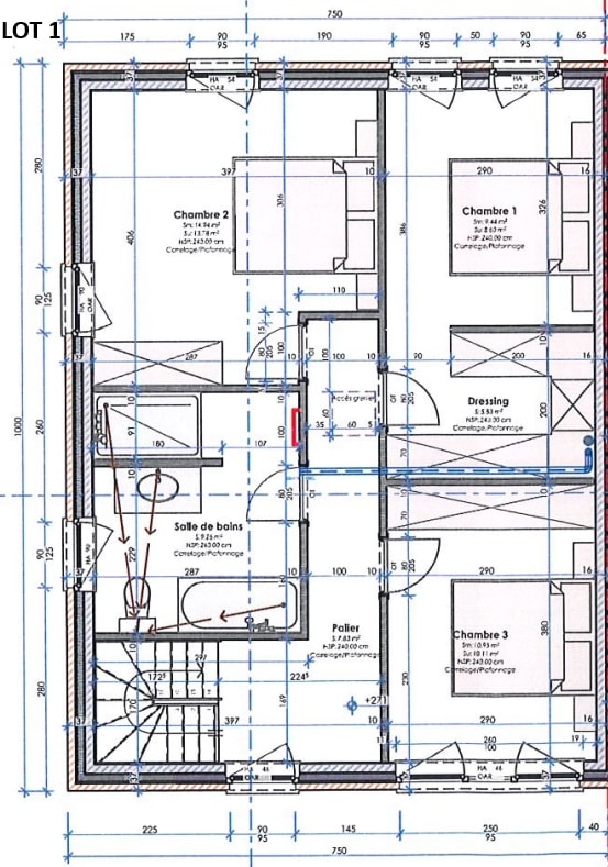 À l’étage, le hall de nuit dessert 3 chambres de +/- 15 m² (avec dressing), +/- 15 m² et +/- 11 m², ainsi qu’une salle de bain de +/- 9,5 m².