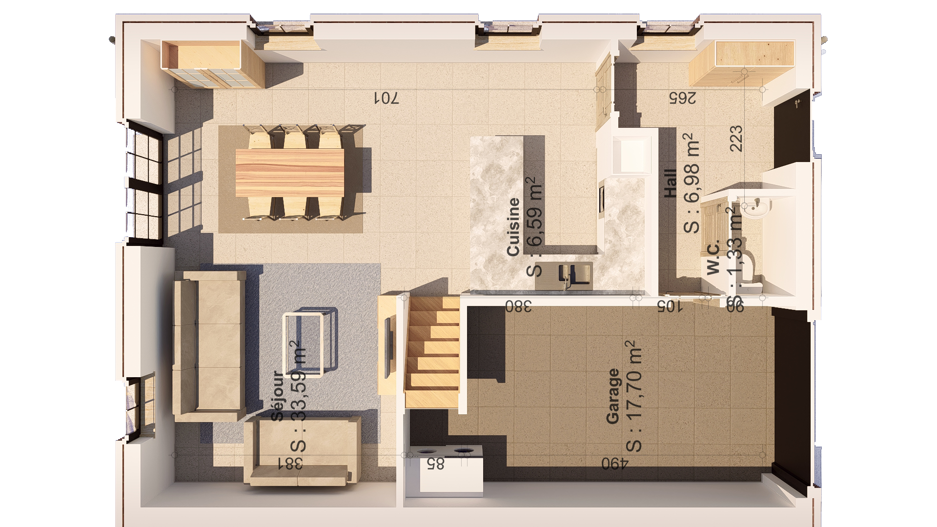 Elle se compose au rez-de-chaussée d’un hall d’entrée de +/- 7 m², d’un WC séparé, d’un lumineux et spacieux séjour de +/- 34 m² avec un espace cuisine ouvert prévu de +/- 7 m² et d’un garage avec espace buanderie de +/- 18m².