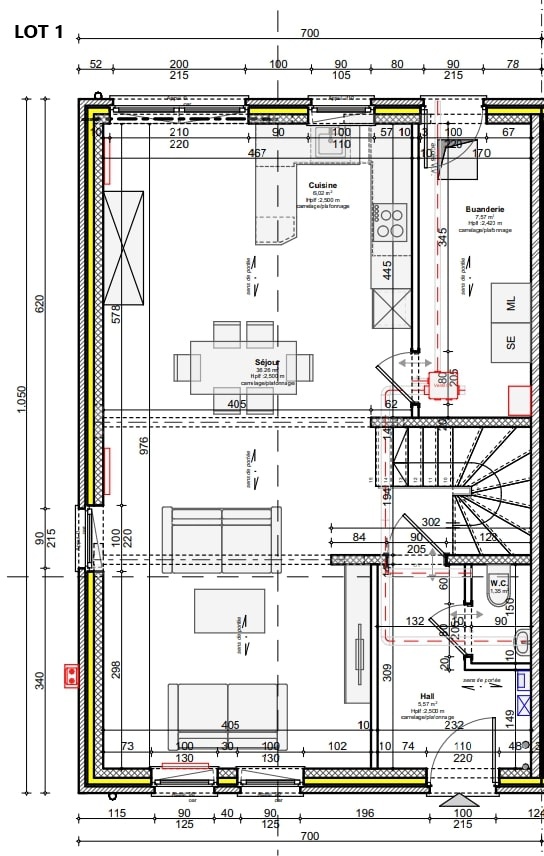 Le rez-de-chaussée est composé d'un hall d'entrée avec WC séparé, d'un séjour de +/- 36 m² avec une cuisine attenante de +/- 6 m². Ainsi qu'une buanderie de +/- 7,5 m².