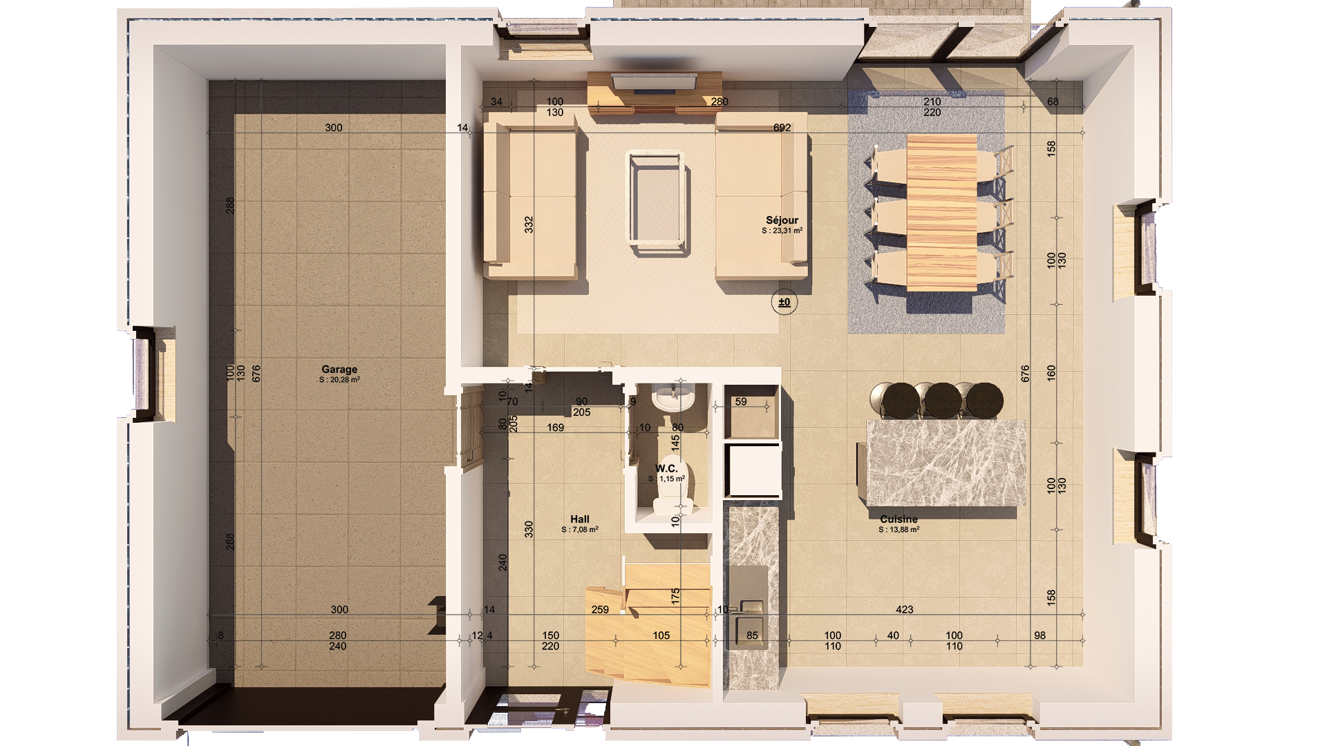 Elle se compose au rez-de-chaussée d’un hall d’entrée, d’un WC séparé, d’un lumineux et spacieux séjour avec espace cuisine ouvert et d’un garage avec coin buanderie.