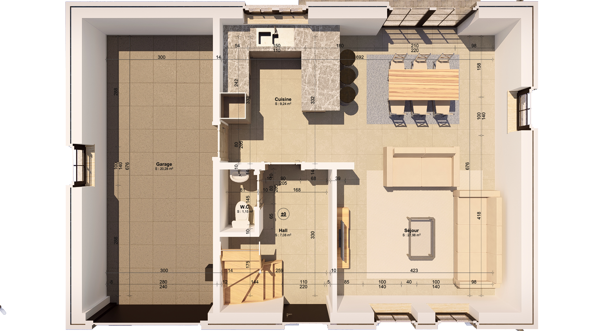 Elle se compose au rez-de-chaussée d’un hall d’entrée, d’un WC séparé, d’un lumineux et spacieux séjour avec espace cuisine ouvert et d’un garage avec coin buanderie.