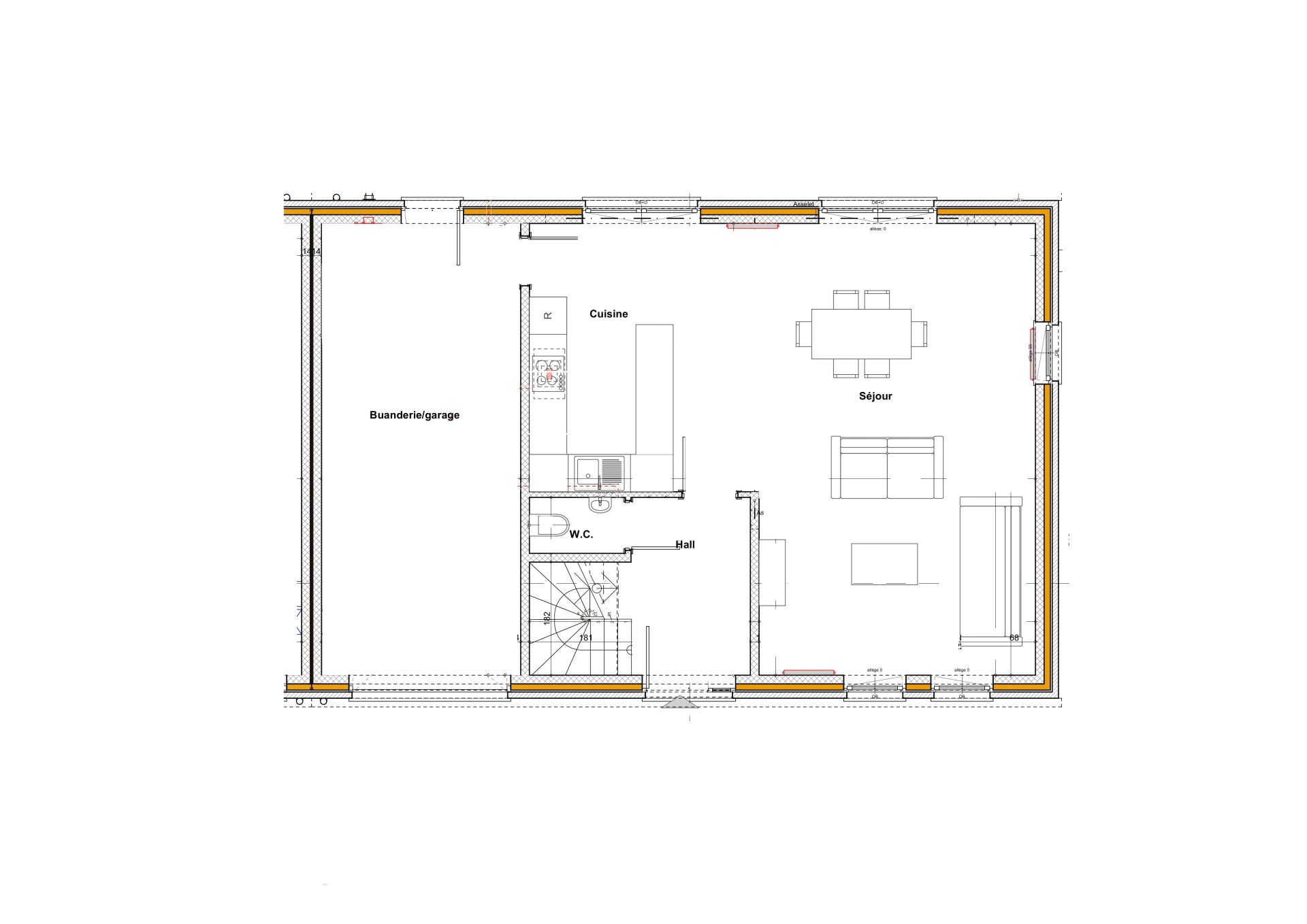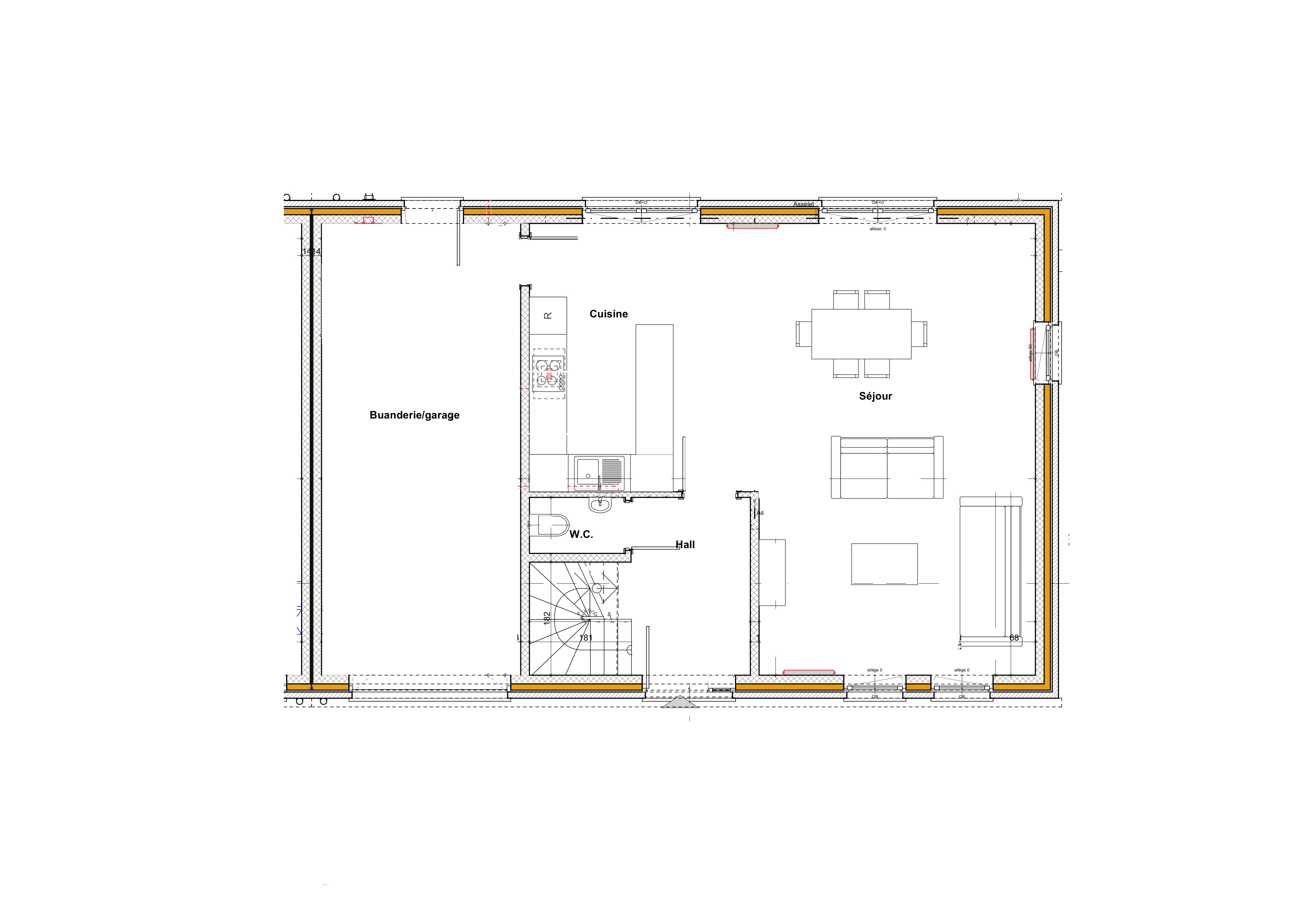 Elle se compose au rez-de-chaussée d’un hall d’entrée, d’un WC séparé, d’un séjour de +/- 32m², d’une cuisine ouverte full équipée de +/- 15m² et d’un garage une voiture de +/- 23m² avec buanderie.