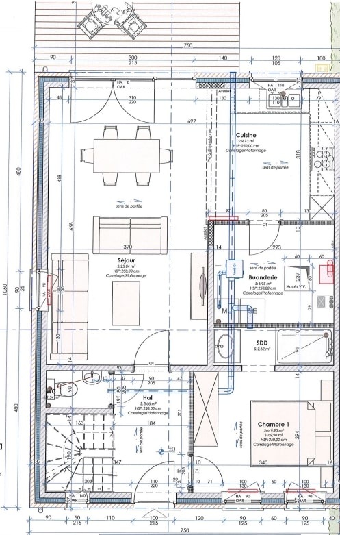 La maison se compose au rez-de-chaussée d’un hall d’entrée, d’un wc, d’un séjour de +/- 26 m² ouvert sur une cuisine équipe de +/- 10 m² et d’une buanderie de +/- 7 m². Ainsi que 1 chambre de +/- 10 m² avec sa salle de douche de +/- 3 m².