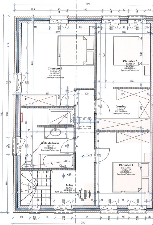 A l’étage, un hall de nuit de +/- 9 m², où il est possible de faire un espace bureau ouvert, qui dessert 1 chambre avec espace dressing de +/- 16,5 m², 2 chambres de 11,5 m² et 17 m², ainsi qu’une salle de bain de 9 m².