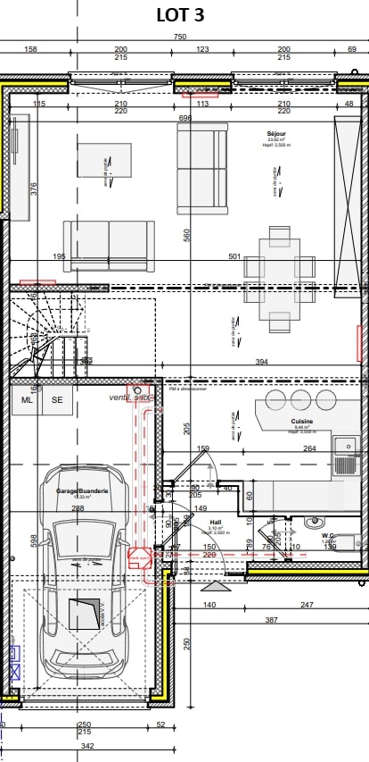 Le rez-de-chaussée comprend un hall d’entrée avec WC, un séjour +/- 33,5 m² ouvert sur une cuisine de +/- 9,5 m².