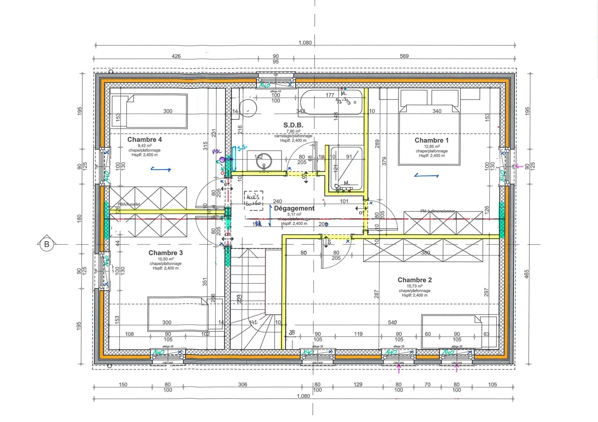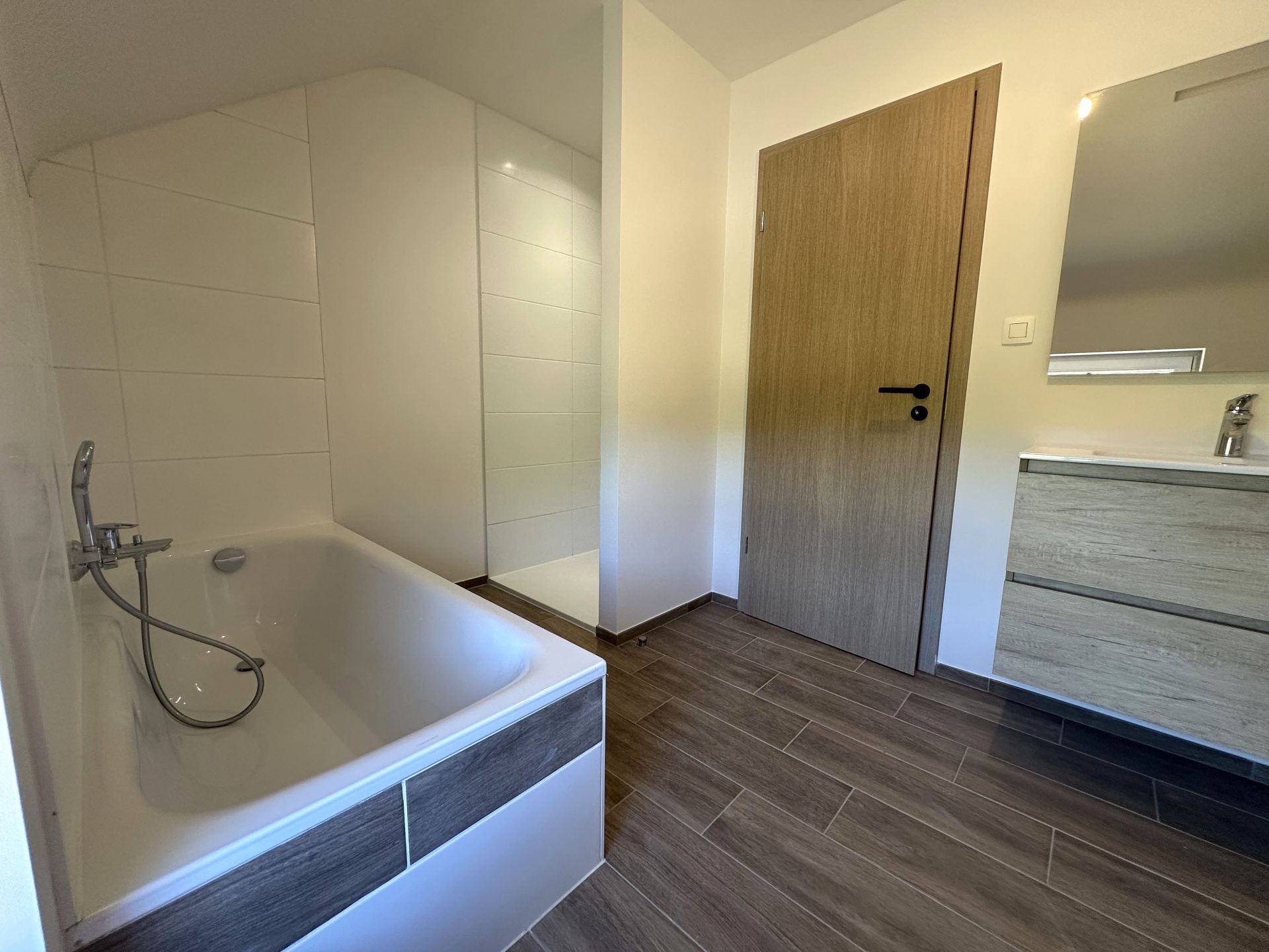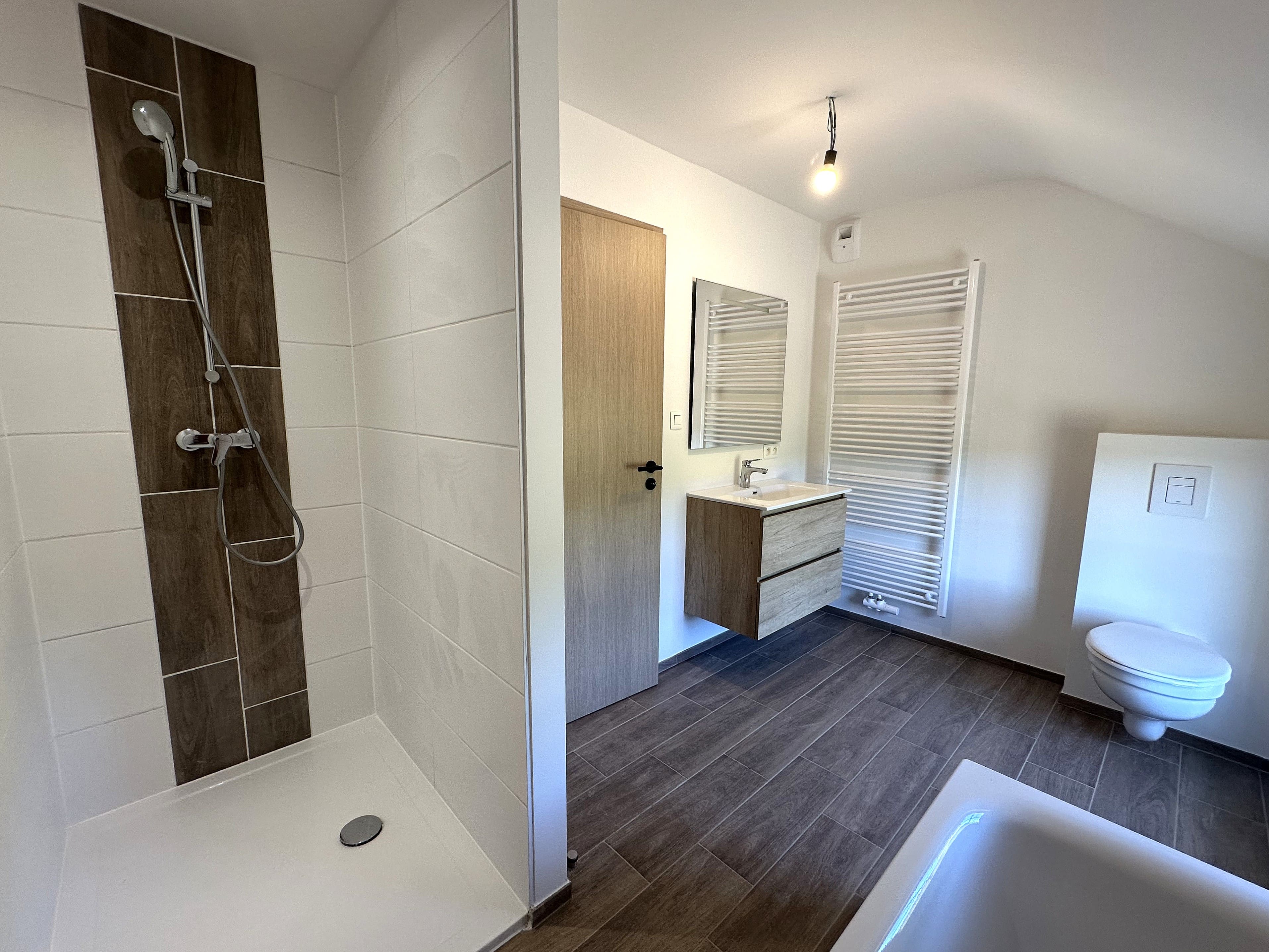 A l’étage vous avez un hall de nuit donnant sur 1 chambre parentale de +/- 15m², de 3 chambres de +/- 12m², 10 m² et 9m² ainsi qu’une salle de bain avec douche, baignoire, meuble lavabo et WC.