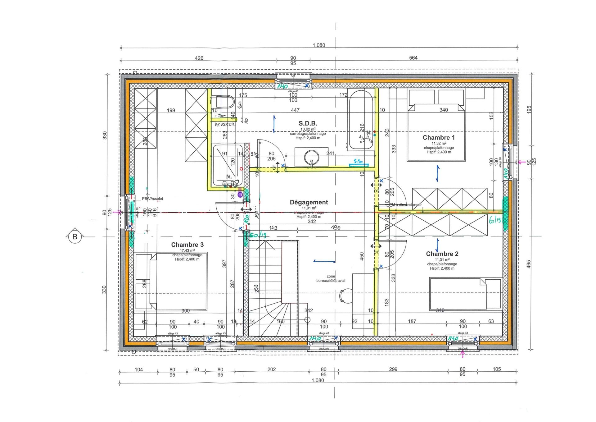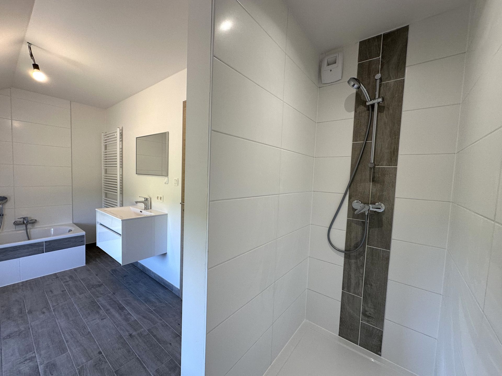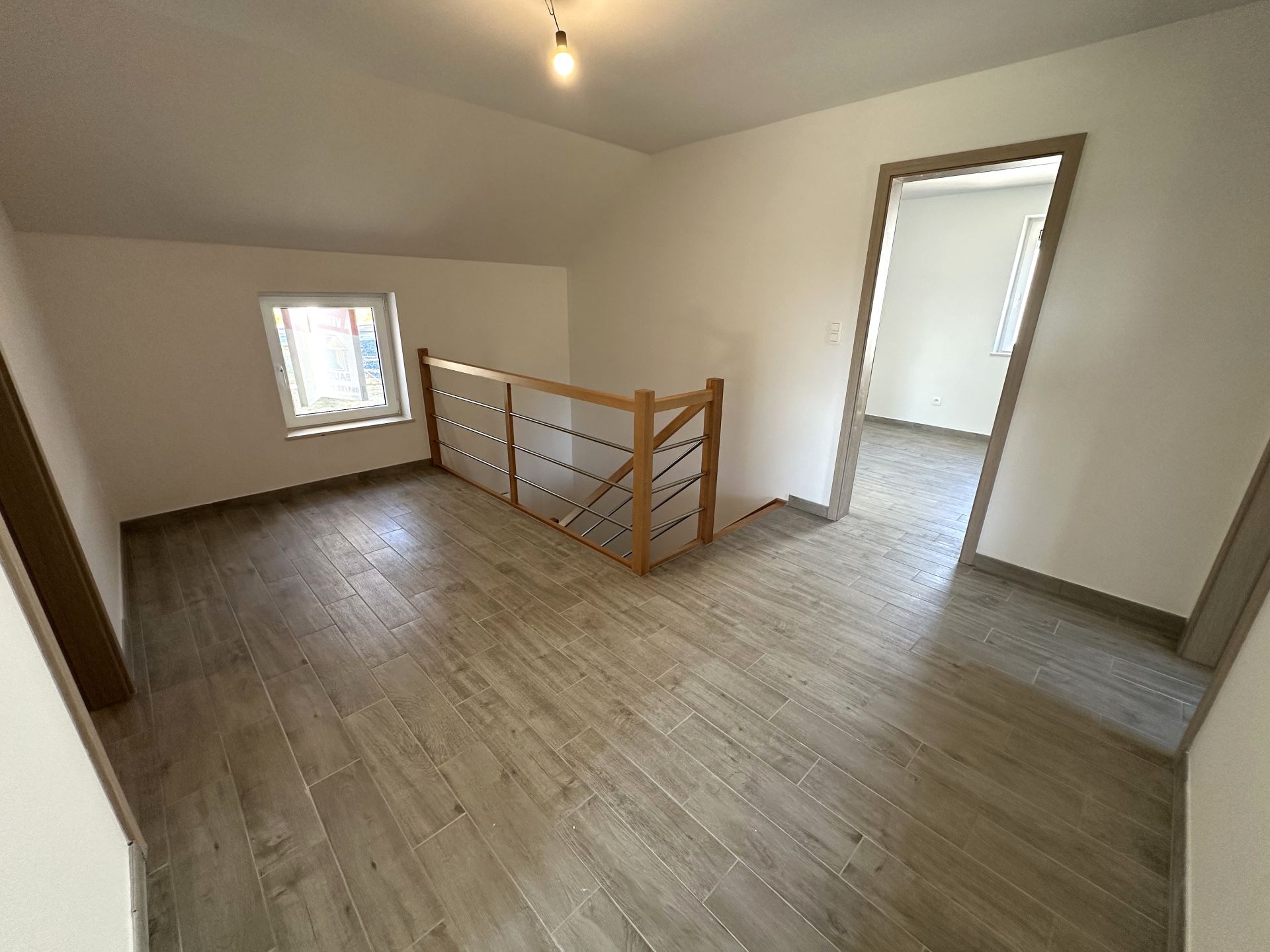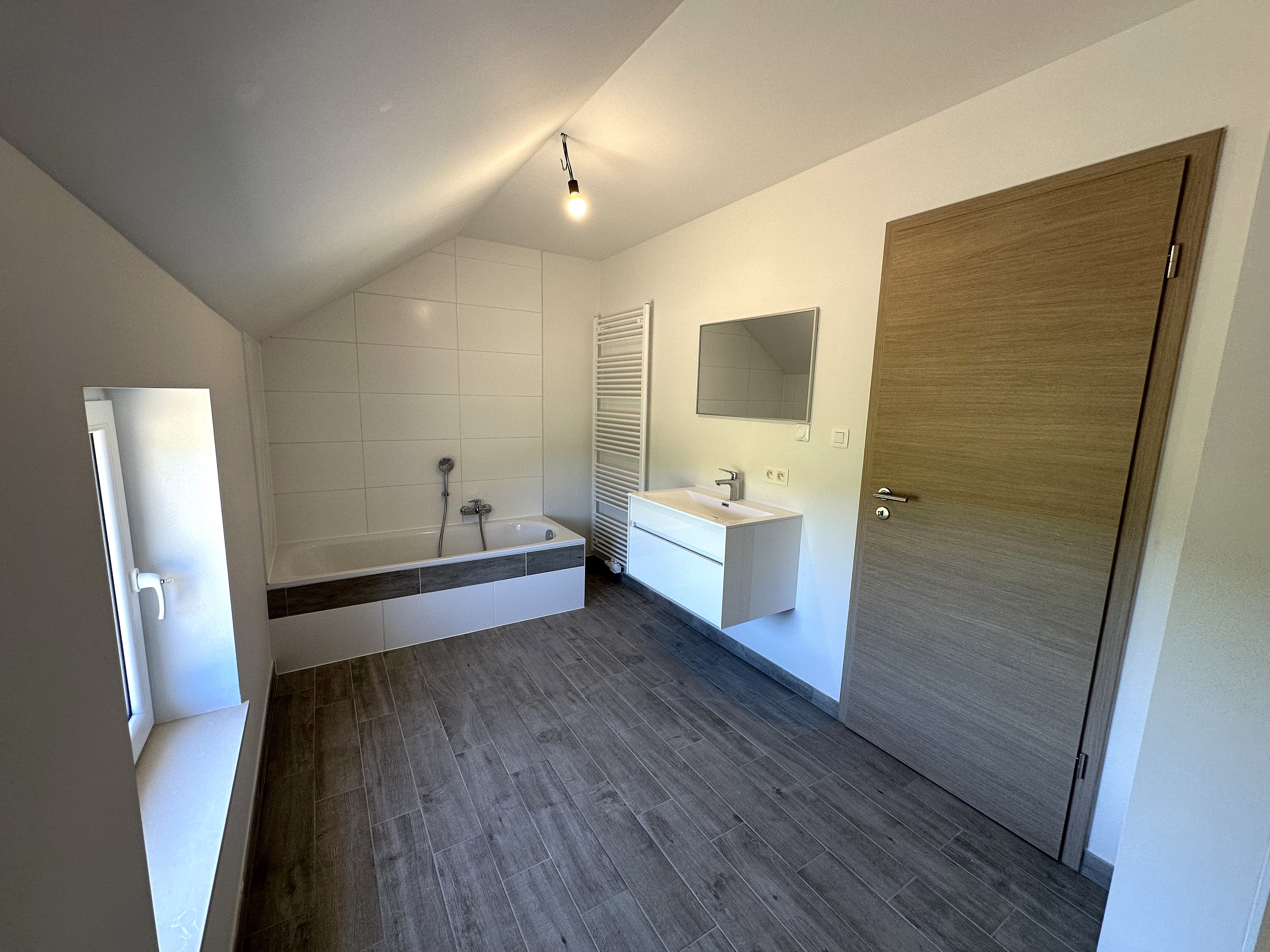 A l’étage vous avez un hall de nuit ( pouvant servir d'espace bureau) donnant sur 1 chambre parentale de +/- 17m², de 2 chambres de +/- 11m² ainsi qu’une salle de bain avec douche, baignoire, meuble lavabo et WC.