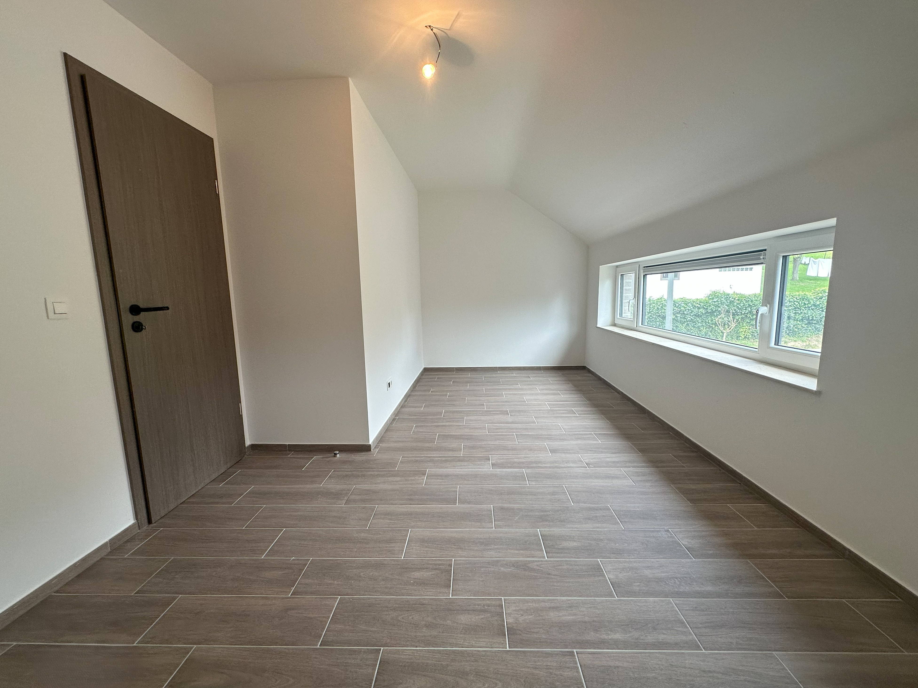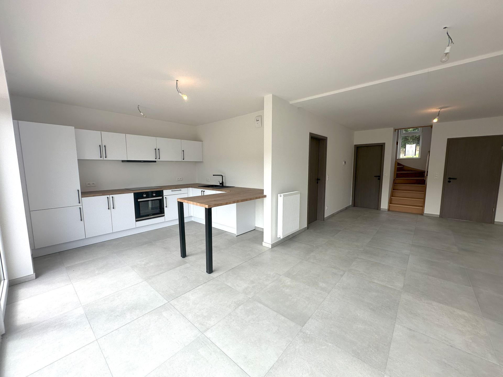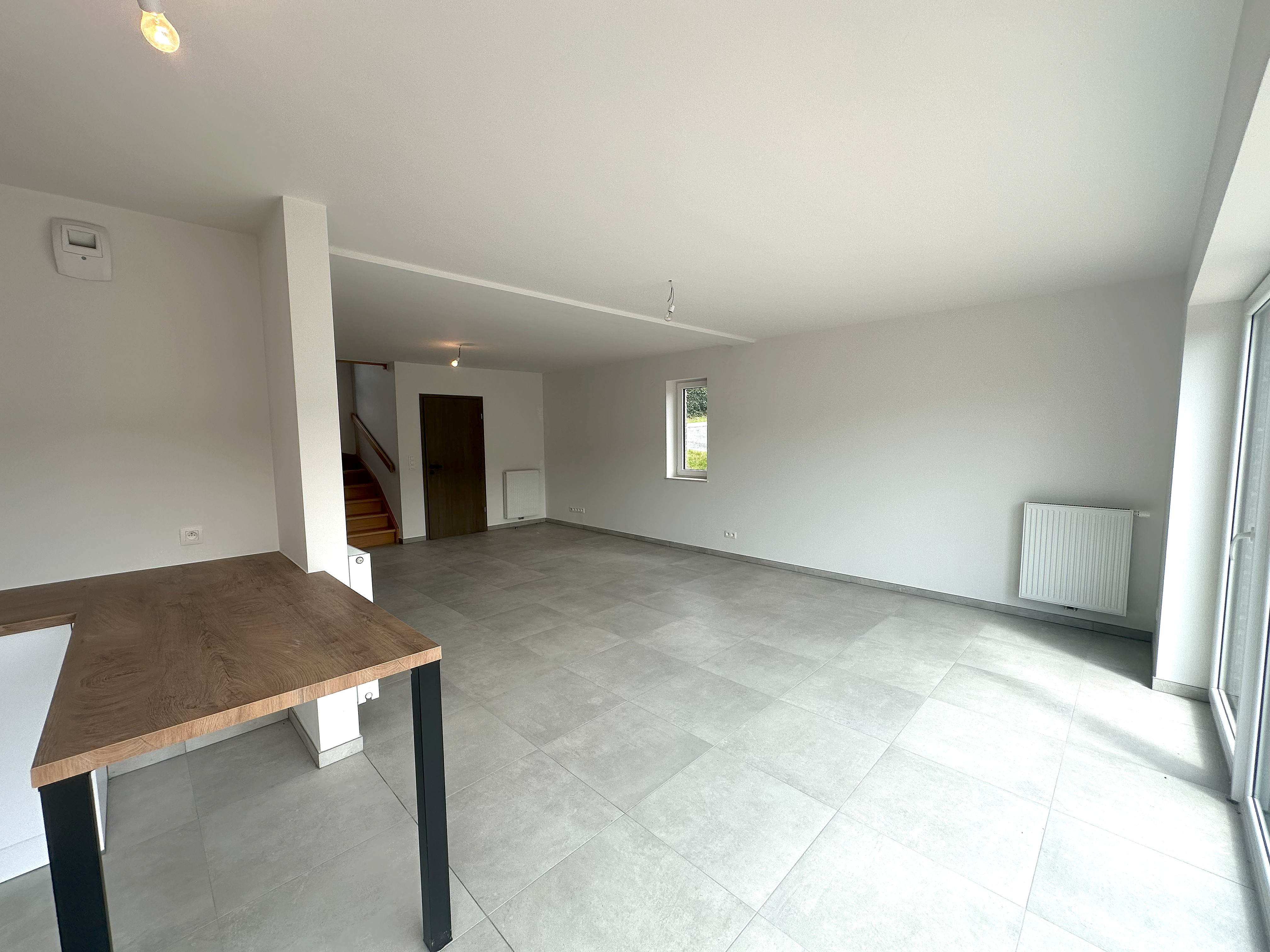 Au rez-de-chaussée : un hall d’entrée, un WC, un lumineux séjour de ± 31 m² ouvert sur la cuisine équipée de ± 9 m², un garage/buanderie une voiture de ± 17 m² avec accès direct au jardin, une terrasse orientée Est