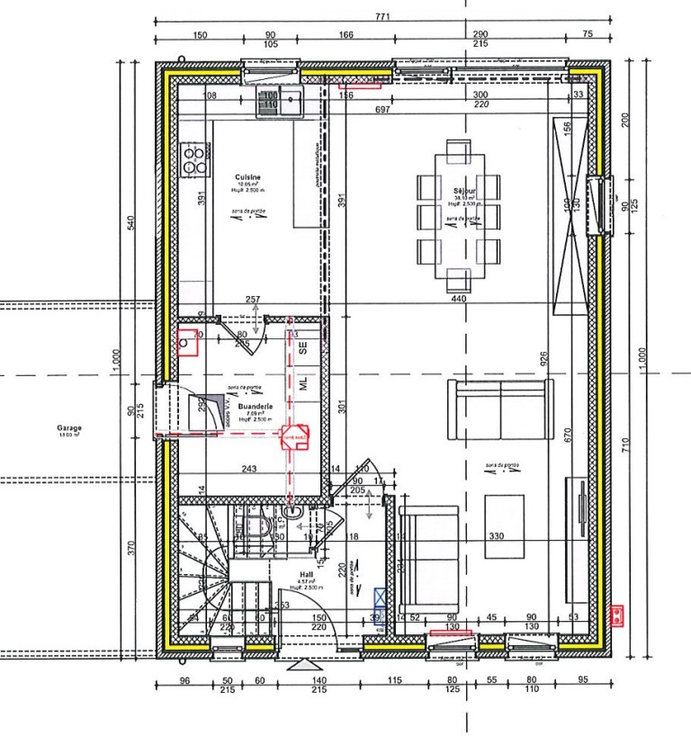 À l’intérieur, le séjour offre un volume de +/-38 m². La cuisine, ouverte et non équipée, s’intègre harmonieusement à l’espace de vie. À l’étage, trois chambres de +/-16 m², +/-13 m² et +/-12 m² sont desservies par un hall de nuit, ainsi qu’une salle de bain de +/-8 m² avec douche et baignoire.
